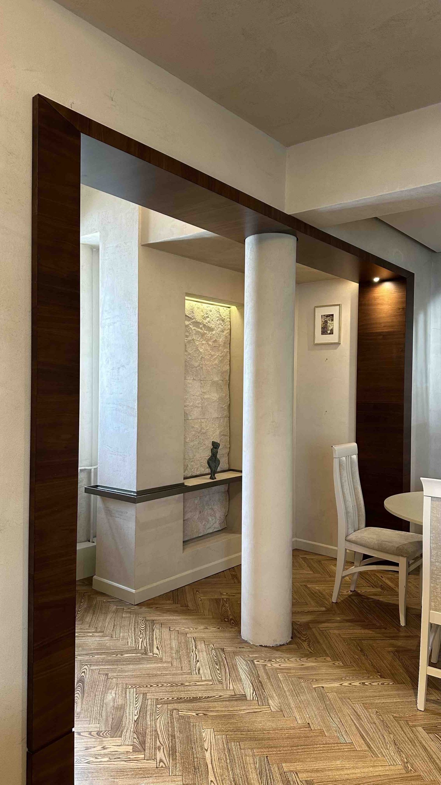 Kroz ceo stan se provlače elementi pravog kamena – botićina i travertina, dok su svi prostori ukrašeni prelepim slikama, skulpturama i dekorativnim elementima.