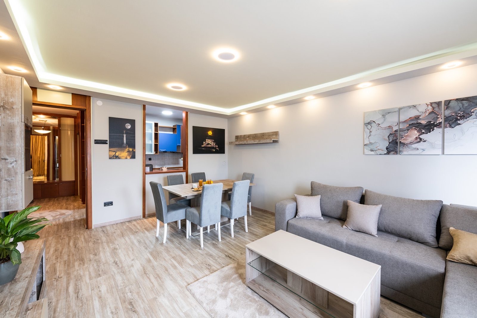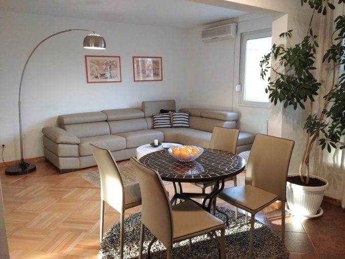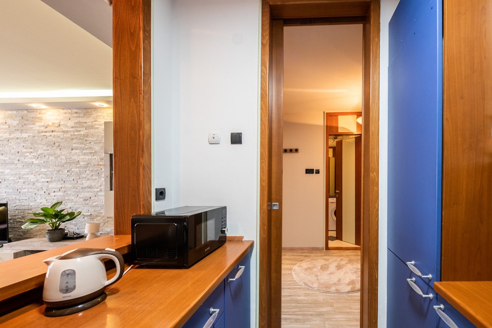 Kvadratura je 60 kvadrata, nalazi se u zgradi sa liftom. Stan se sastoji iz predsoblja, prostrane dnevne sobe i trpezarije, kuhinje, kupatila, spavaće sobe, ostave, zastakljene lođe, a od uređaja ima veš mašinu, mašinu za sušenje veša, mašinu za pranje sudova, frižider, zamrzivač, mikrotalasnu rernu, male kućne aparate, dosta posuđa, posteljine i peškira koje mogu da stavim na raspolaganje, ukoliko je zakupac zainteresovan.