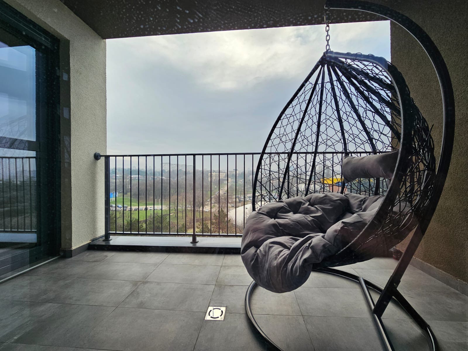 Terrace: A large terrace with an „egg“ swing chair adds a touch of magic, offering an enchanting view of the park and half of Belgrade.