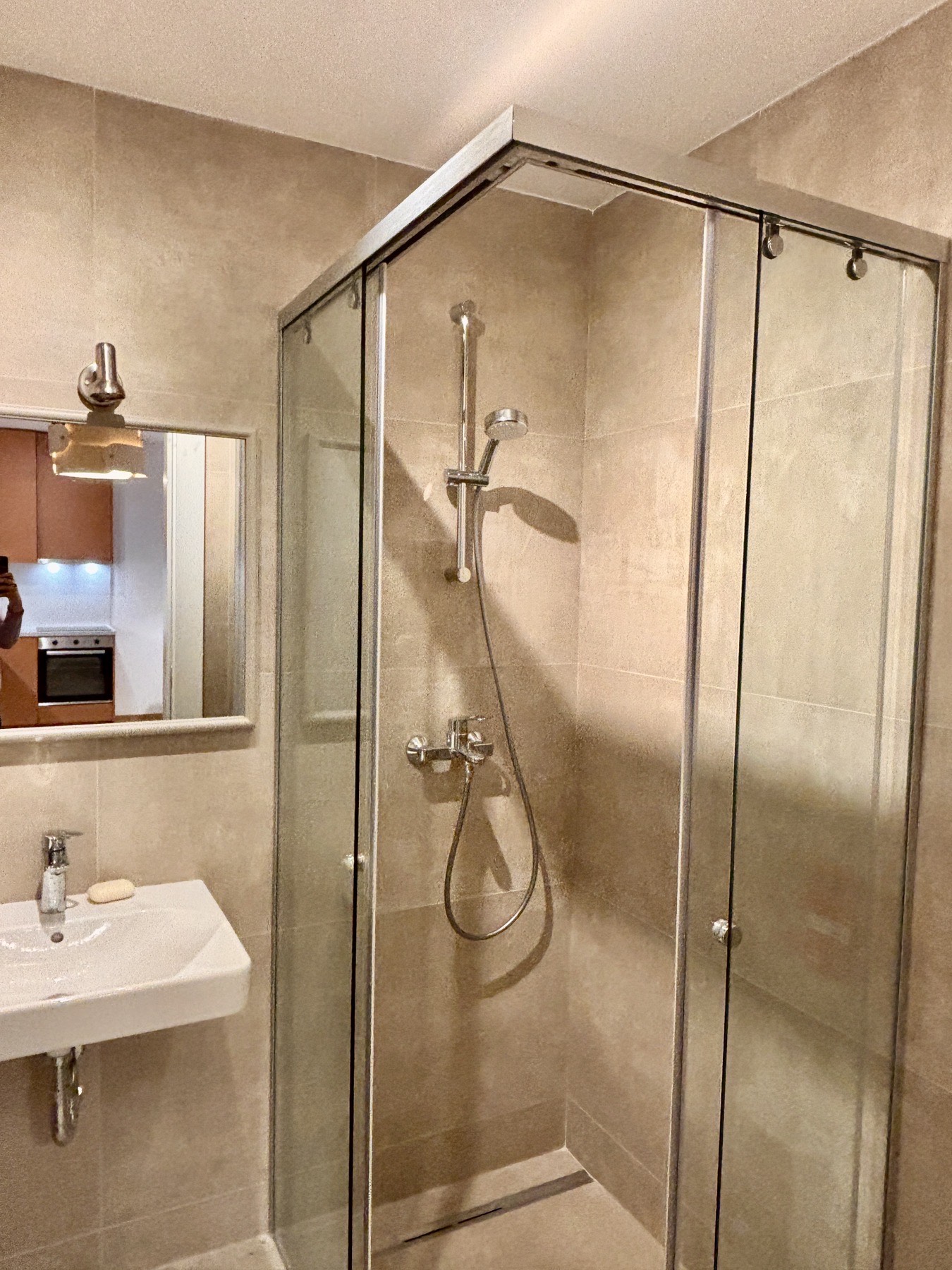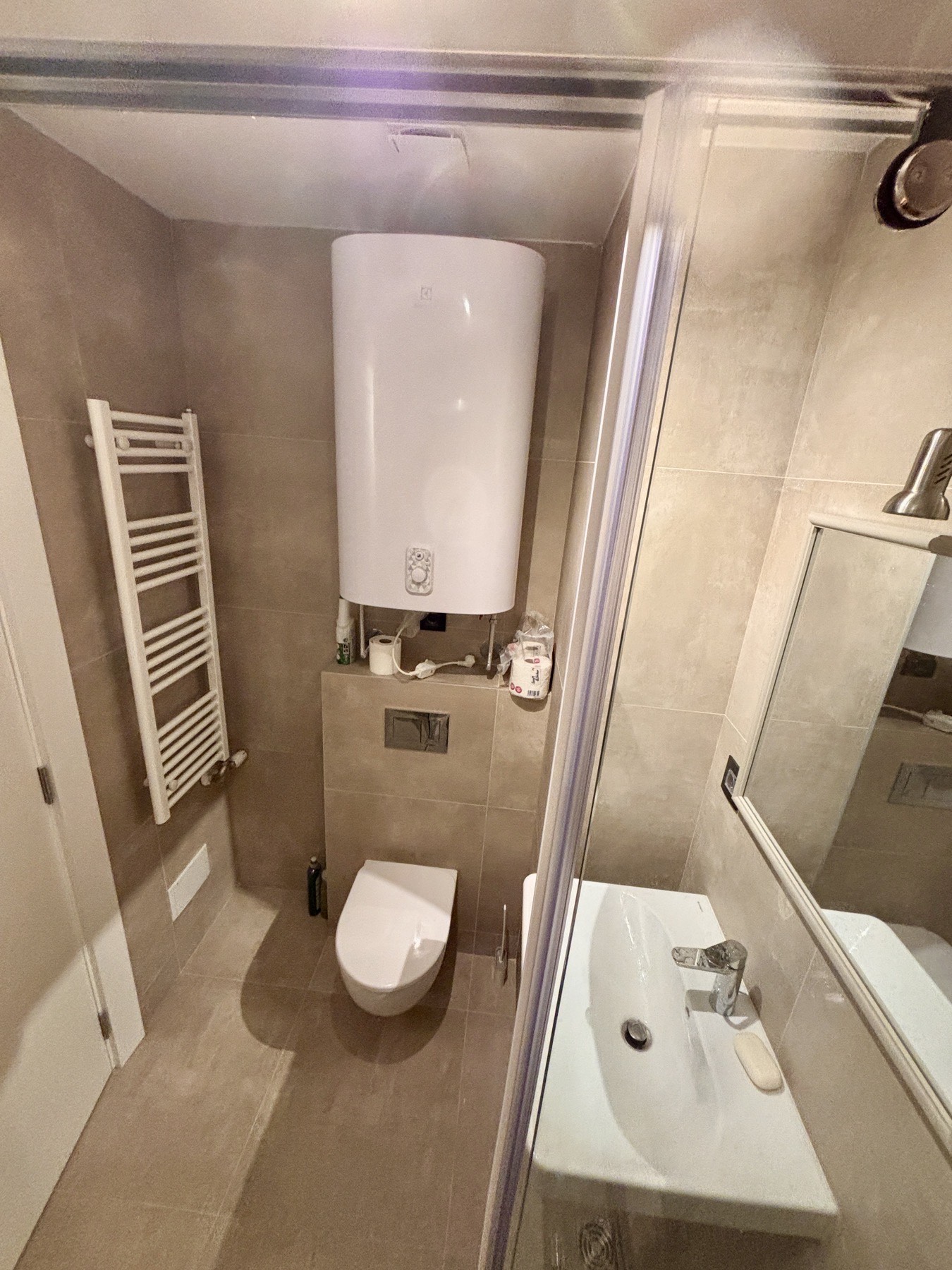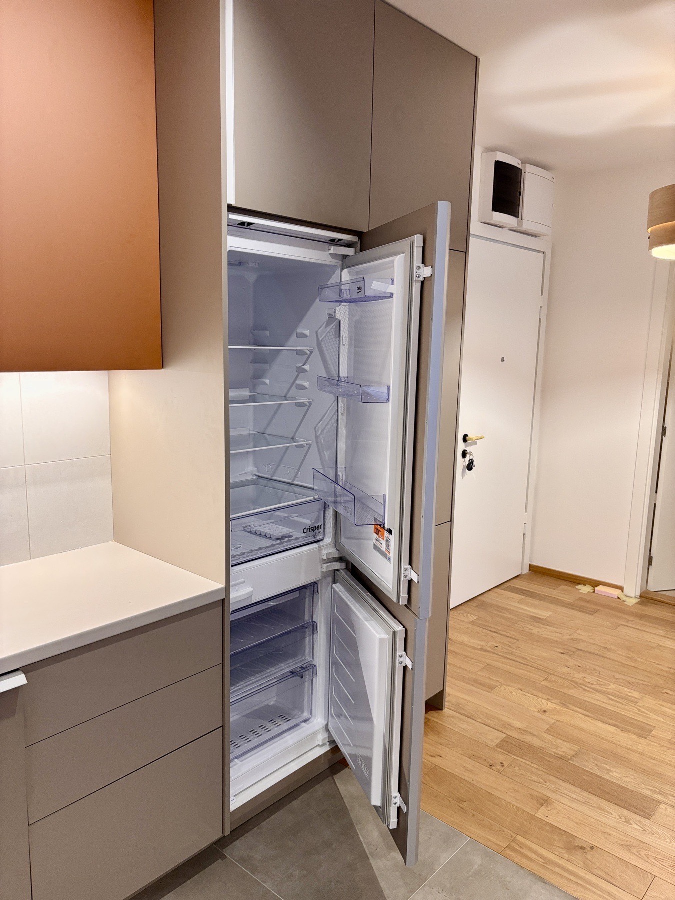 Ugradni frižider i sudomašina, rerna, indukciona ploča i aspirator, veš mašina, klima, TV, izuzetno lep i svetao sa prostranom terasom.
