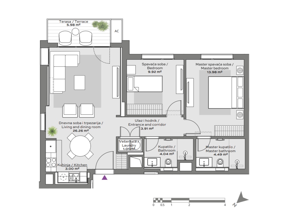 Kupatila: Stan poseduje dva kupatila – jedno je en suite u master spavaćoj sobi. Oba kupatila su kompletno završena i opremljena ormarićima. Ostava: Praktična ostava za dodatno odlaganje u kojoj se nalaze mašina za sušenje i mašina za pranje veša. Garaža: DVA garažna mesta na nivou -1 ( doplata: 100 EUR)