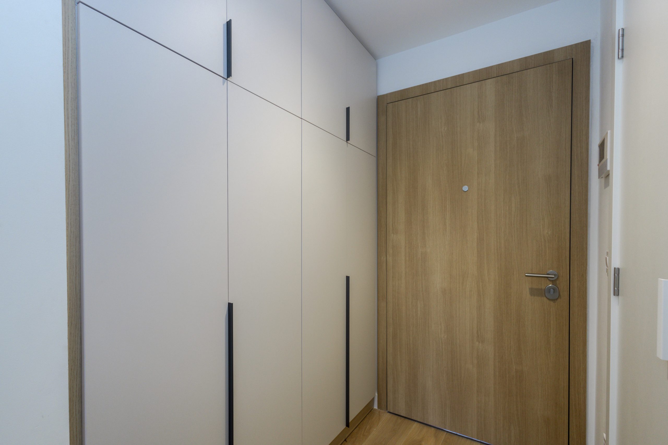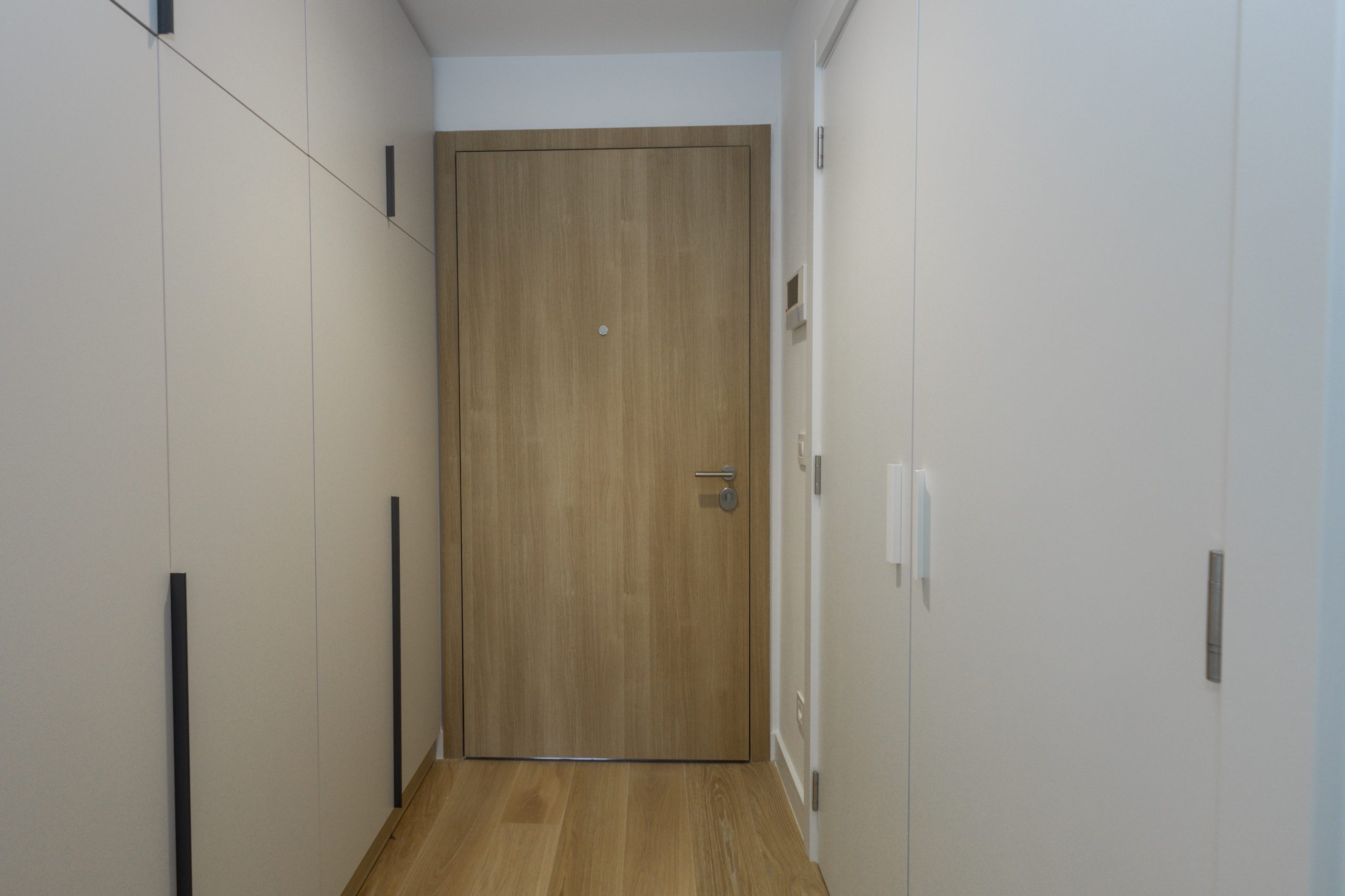 Stan ima dve spavaće sobe (svaka sa ugradnim plakarom, što se trenutno ne vidi na slikama), prostran dnevni boravak i najsavremeniju ugradnu kuhinju sa svim uređajima. U stanu se nalaze mašina za pranje i mašina za sušenje veša, kao i elegantne električne rolo zavese.
