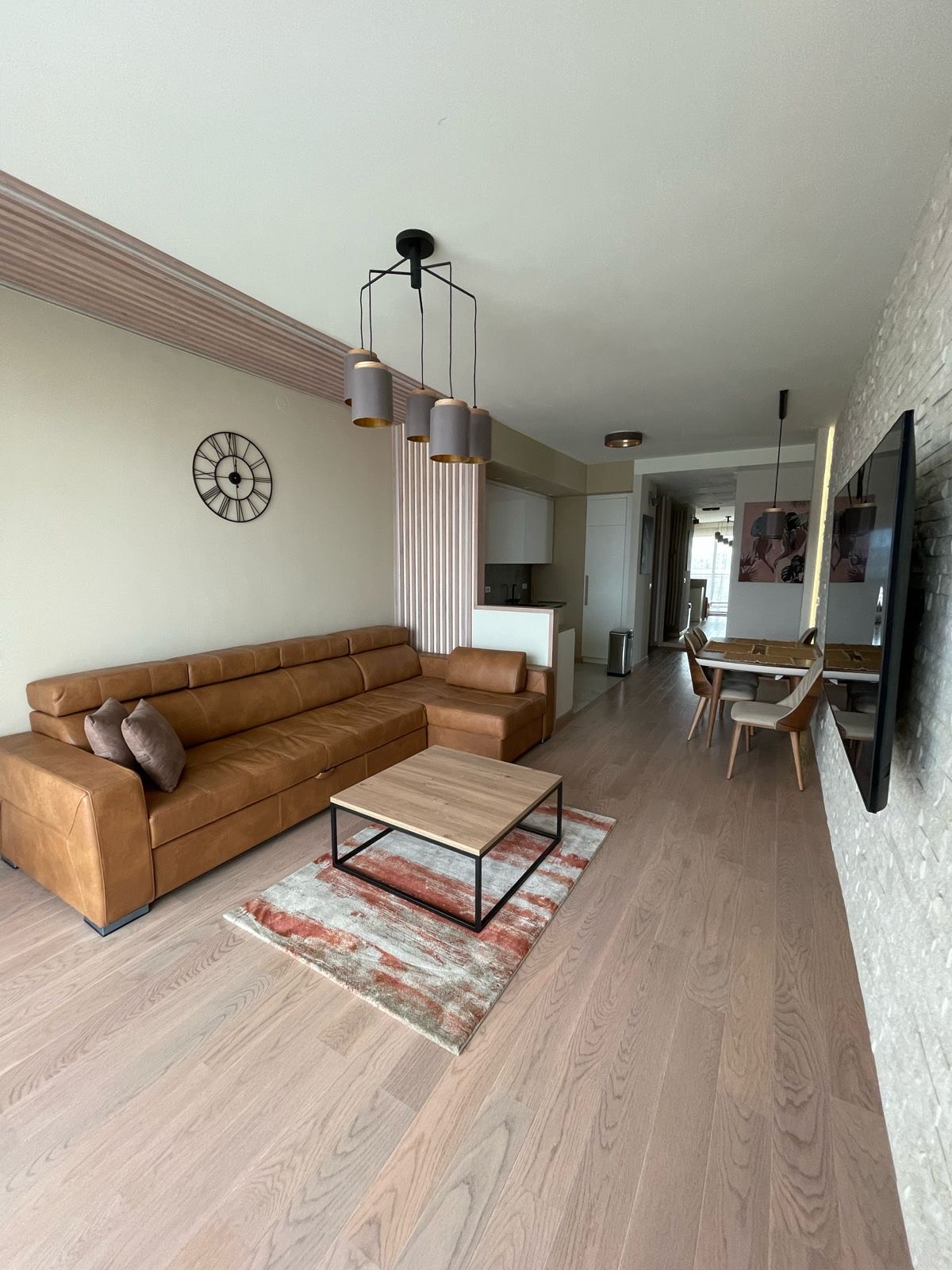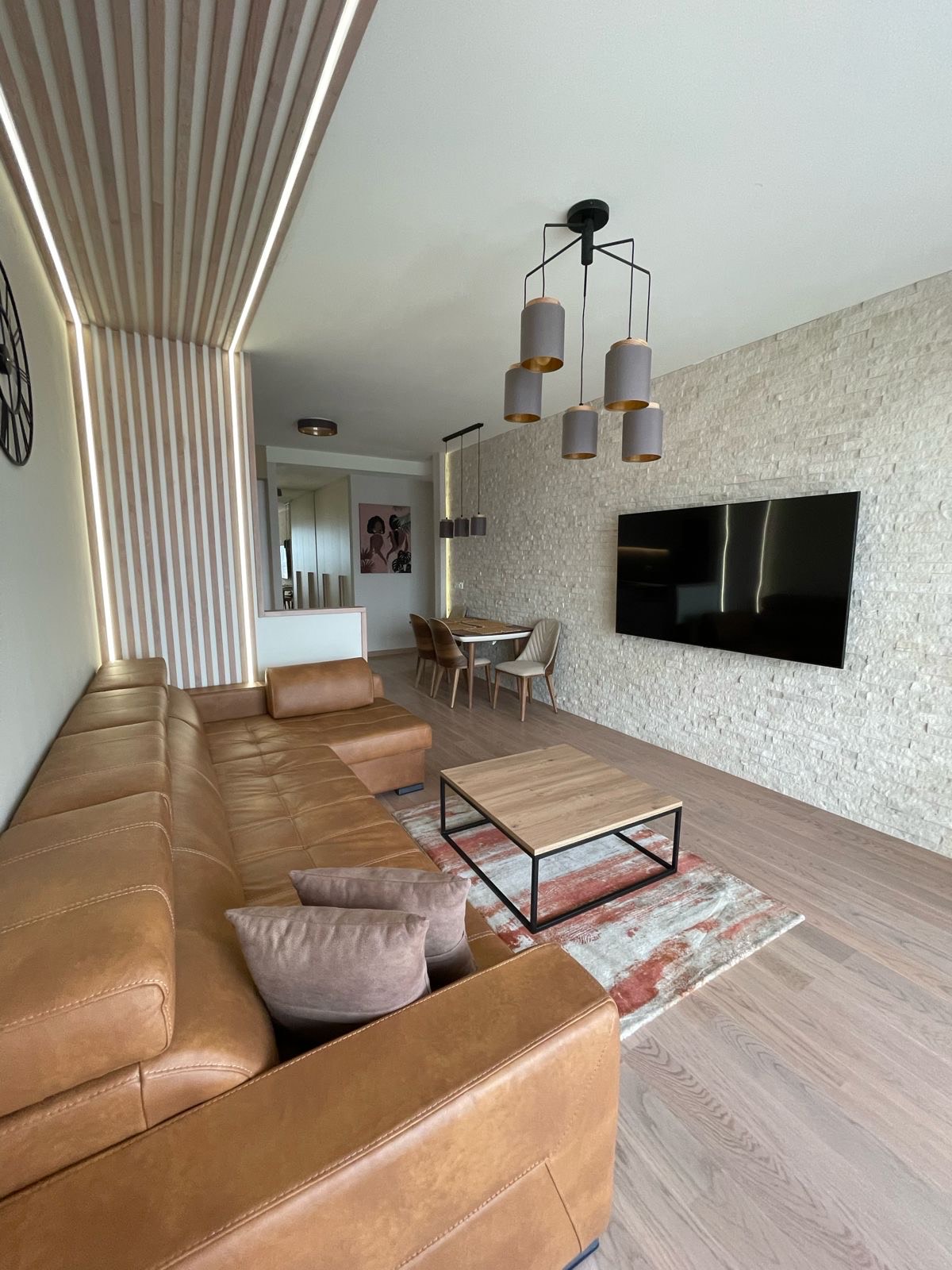 Za dekoraciju, korišćeni su prirodni kamen i drvo. U dnevnoj sobi se nalazi televizor Samsung ( dijagonala 75 ) i velika ugaona garnitura od prirodne holandske kože premijum klase, koja se razvlači, u slučaju da Vam dodji gosti. Kuhinjski sto je moguće razvući, što može poslužiti kao odličan povod da vreme provedete sa svojim bliskima.