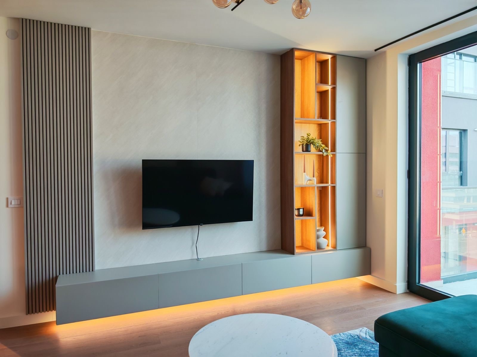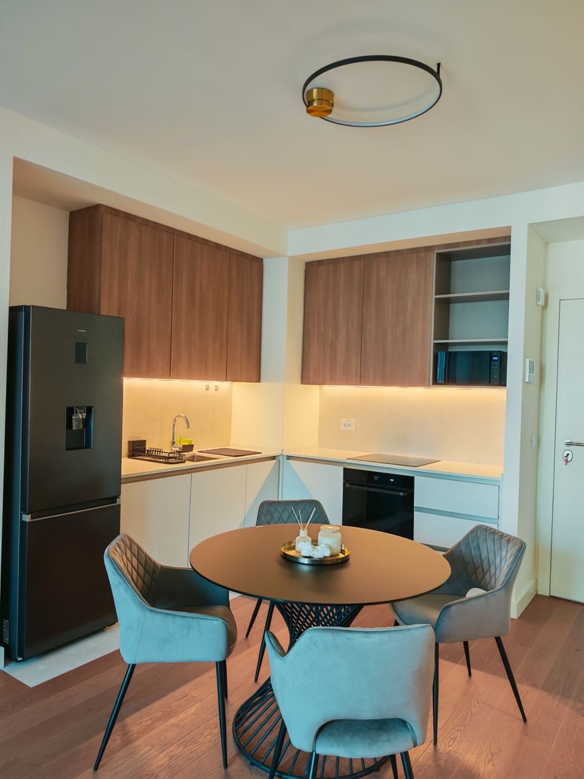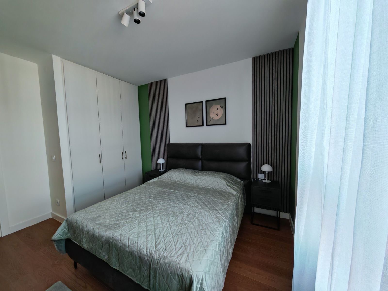 Stan se nalazi u Beogradu na vodi, Quartet III, na 7. spratu, severo-istočno orijentisan (pogled ka Savksoj ulici, Palati Pravde), moderno opremljen. Stan je nov, namešten, po strukturi dvosoban i sastoji se iz dnevno kuhinjsko trpezarijskog dela, spavaće sobe, kupatila, vešernice i terase. Svaka soba sadrži klima uređaj. Grejanje je centralno po utrošku. Useljiv odmah. Obavezan depozit.