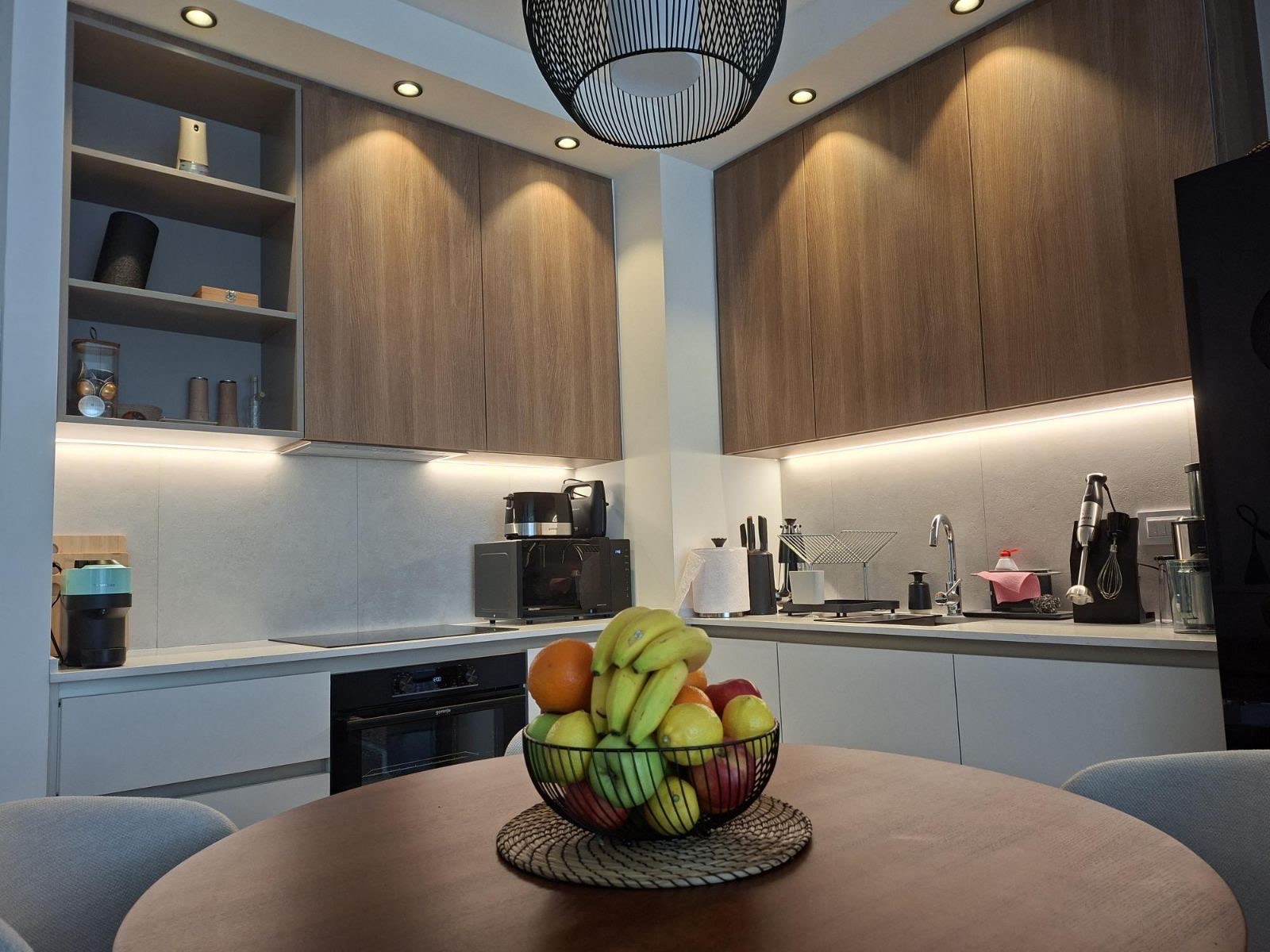 Apartman poseduje dnevnu sobu sa trpezarijom, kuhinju, odvojenu spavaću sobu, terasu, kupatilo i vešernicu. Kuhinja je opremljena najmodernijim kuhinjskim elementima, frižiderom sa zamrzivačem, mašinom za pranje posuđa, mikrotalasnom rernom, keramičkom pločom i rernom sa kompletnim posuđem i escajgom za ručavanje. Apartman poseduje mašinu za pranje i sušenje veša, peglu, dasku za peglanje i fen za kosu. Apartman ima brzi wi-fi, kablovsku TV, centralno grejanje i dve multisplit klima uređaja tako da svaka prostorija u stanu ima svoju nezavisnu jedinicu. Apartman poseduje pripadajuće garažno parking mesto u garaži zgrade (nivo -1).