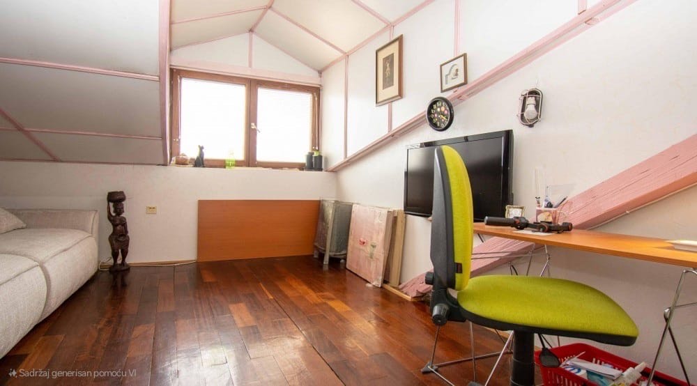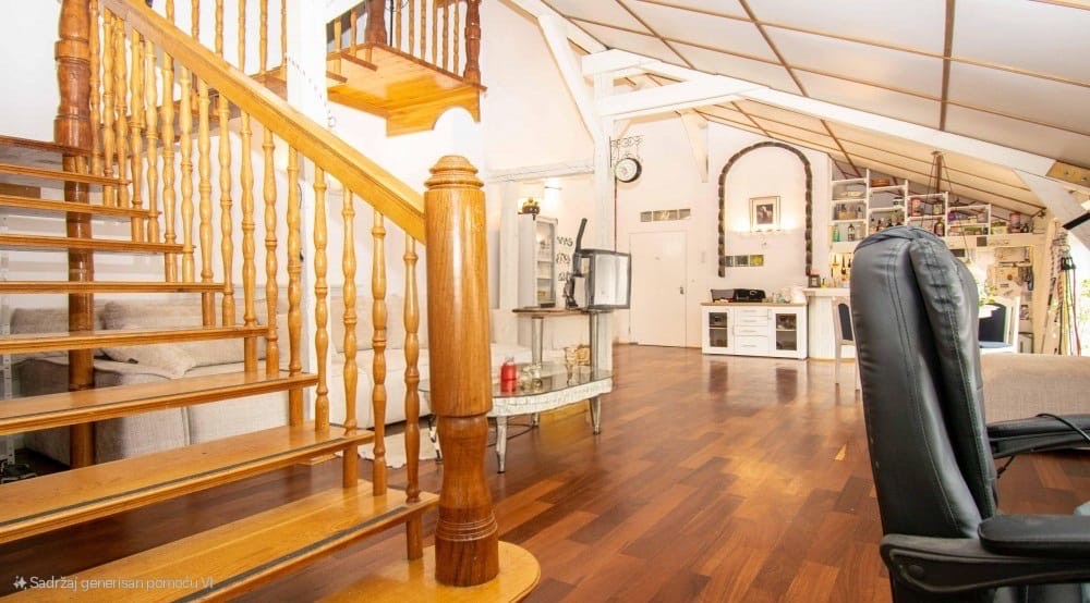 The lower level, with French balconies, consists of a large living room with an open kitchen, under a ceiling up to six meters high. The upper level is calm and quiet, with two bedrooms, a bathroom and a terrace with a beautiful view of Belgrade. The floors are made of authentic African wood, and an additional accent is given by a wooden staircase. Directions favorable, tidy, obedient dog welcome.