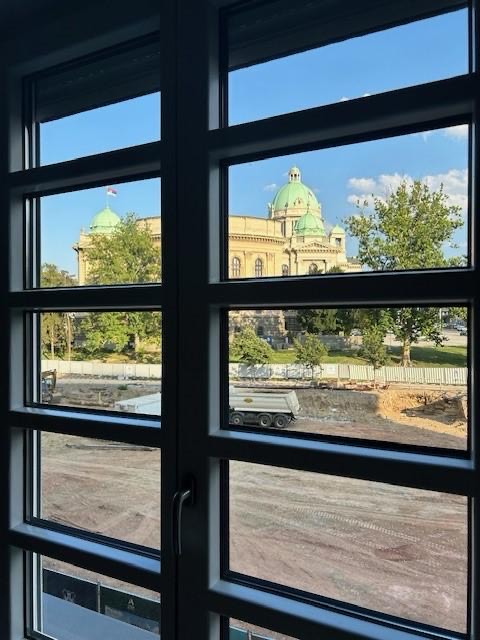 Izdaje se moderan stan u industrijskom stilu u Vlajkovićevoj ulici sa pogledom na Skupštinu (drugi sprat, dvostrano orijentisan, nenamešten).