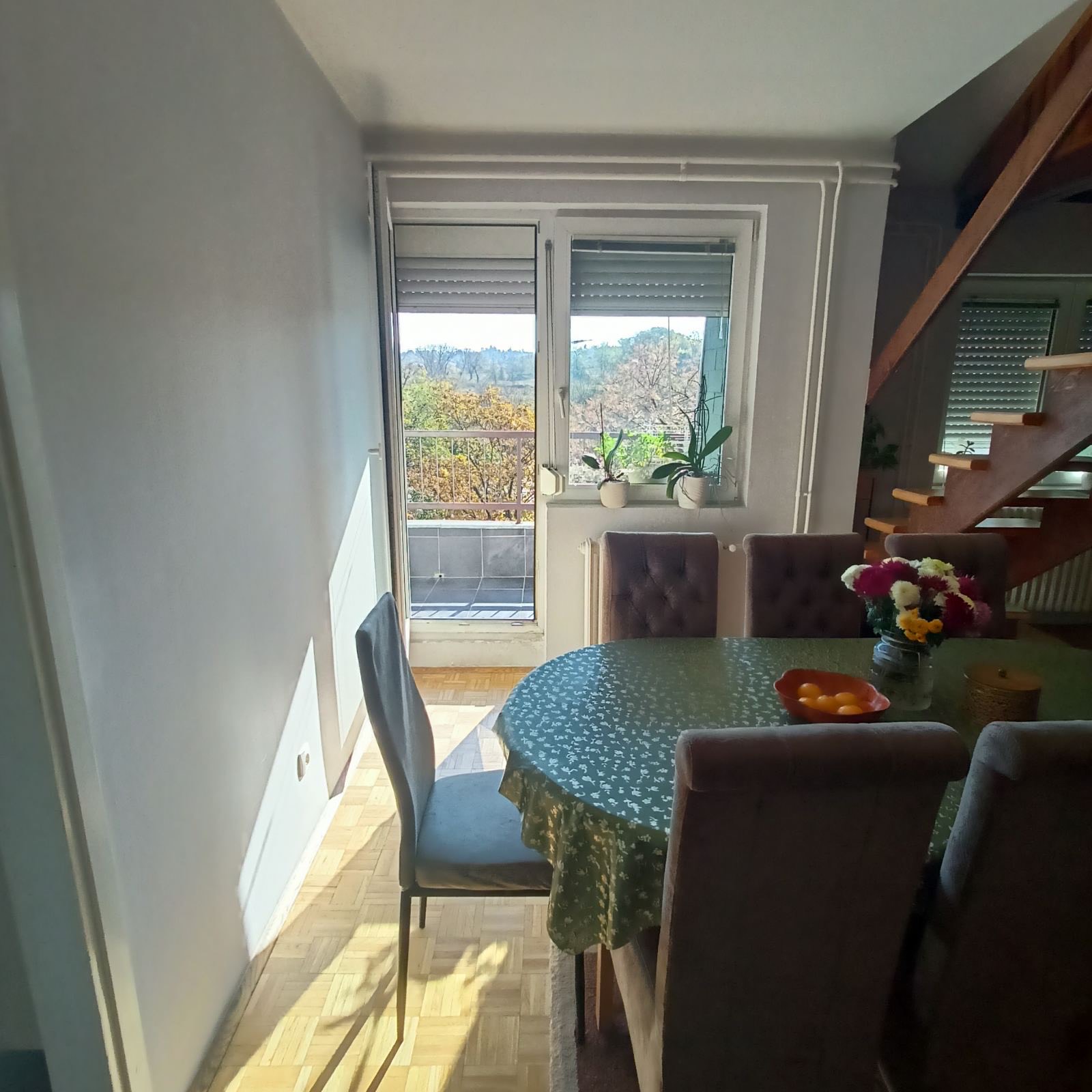 Izdajemo duplex stan koji se nalazi u blizini Farmaceutskog Fakulteta i prostire se na 85 m2. Stan se nalazi na četvrtom i petom spratu zgrade bez lifta. Donji nivo ima prostran dnevni boravak sa trpezarijom i izlazom na terasu. Na pomenutom nivou se nalazi još i velika spavaća soba, kupatilo, hodnik i odvojena kuhinja.