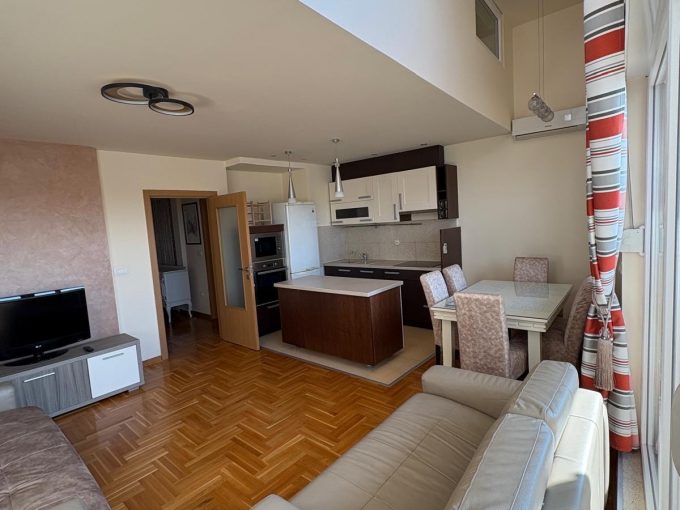 Stan je trosoban, sastoji se od dnevne sobe, moderne trpezarije sa kuhinjom, hodnika, dve spavace sobe, kupatila i wc-a. Stan poseduje pripadajuće parking mesto u podzemnoj garaži koje je uračunato u cenu izdavanja. Obavezan depozit.