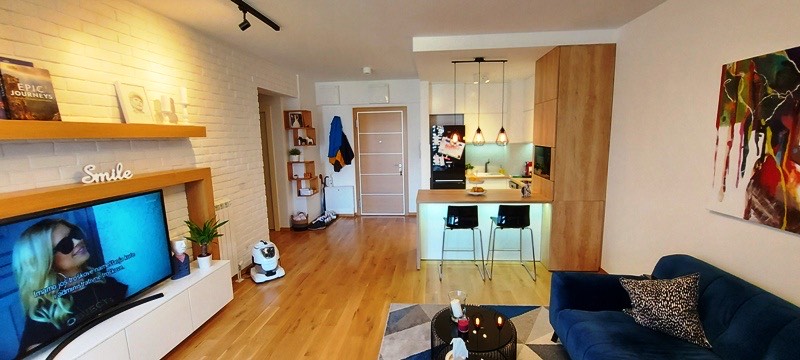 The apartment consists of a spacious living room with an equipped kitchen, two separate bedrooms, a bathroom, a partitioned wardrobe that offers additional functionality, as well as a terrace overlooking the courtyard of the complex. The complete furniture in the apartment is carefully designed and made of high quality materials.