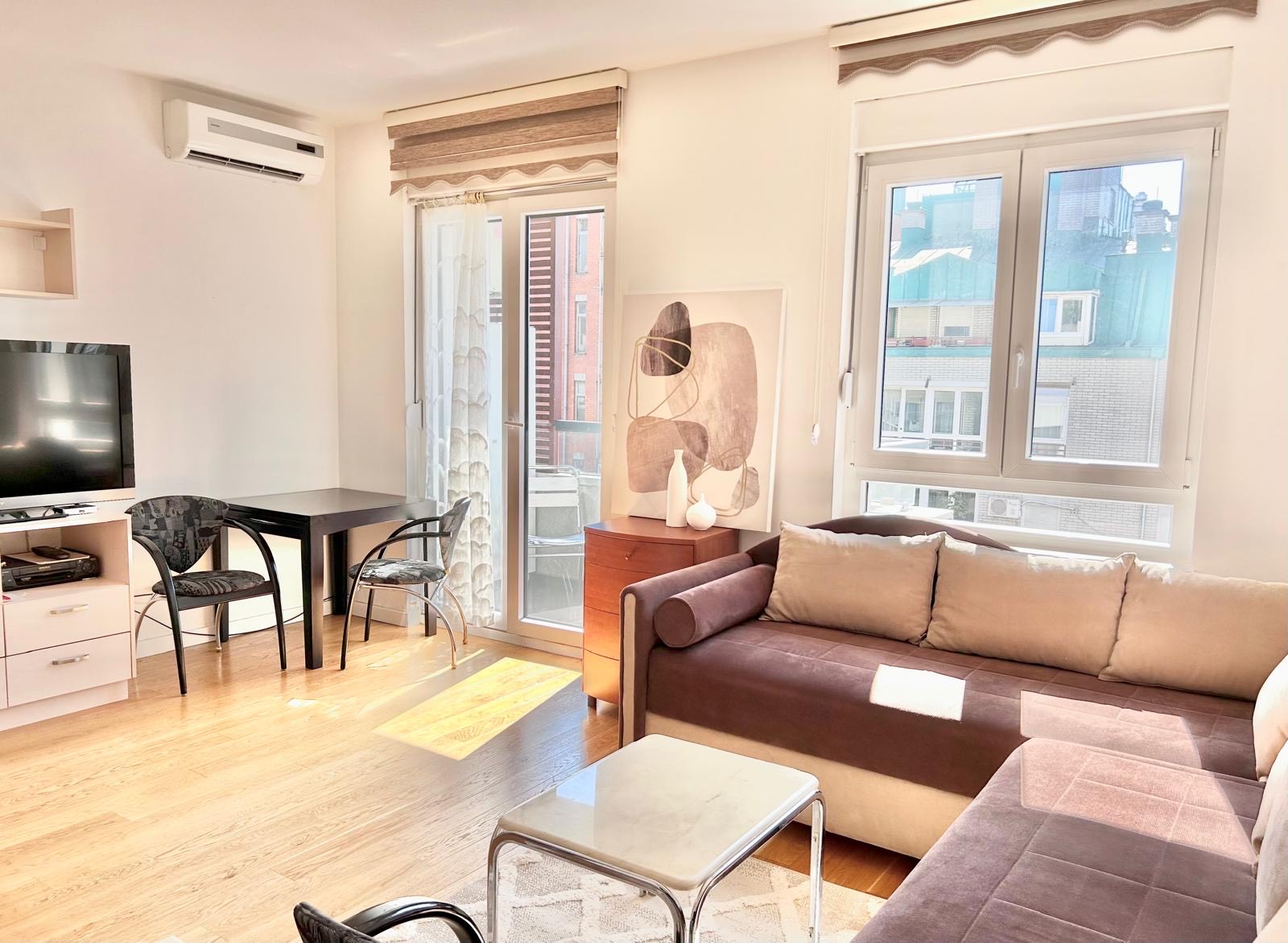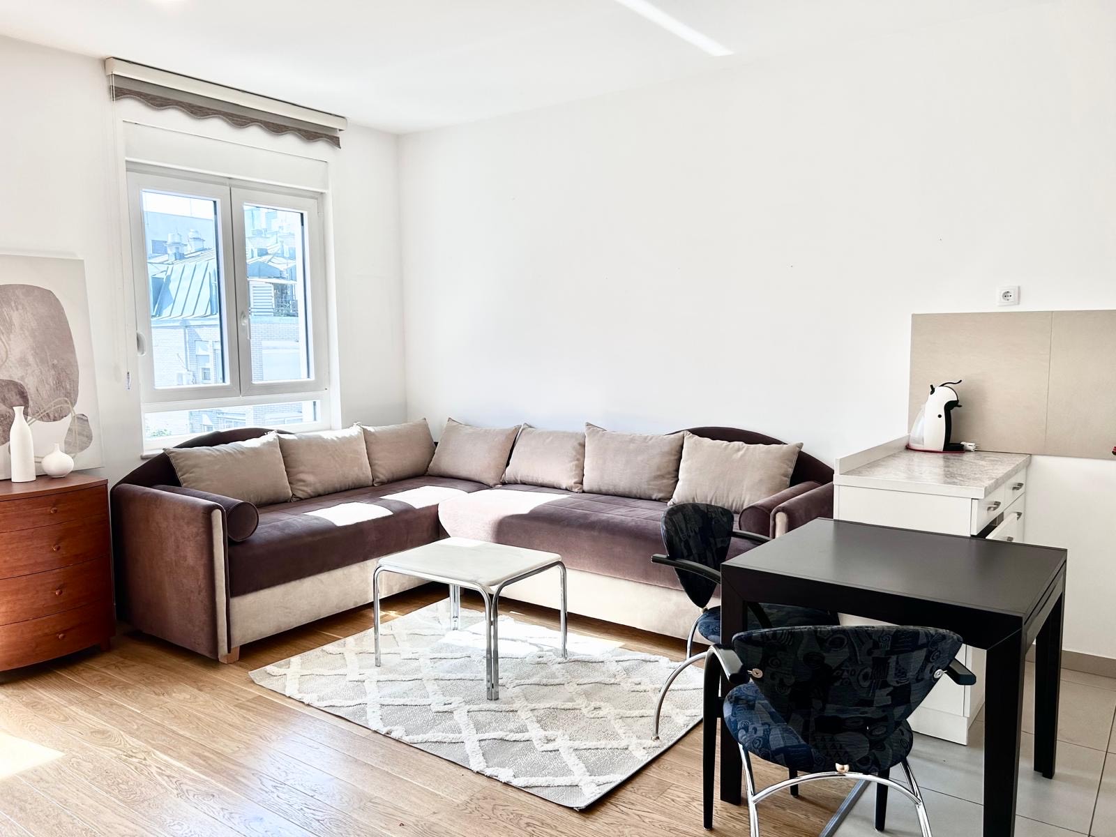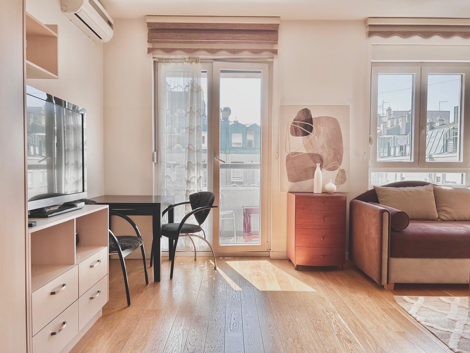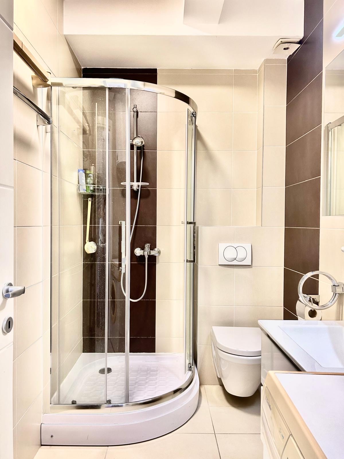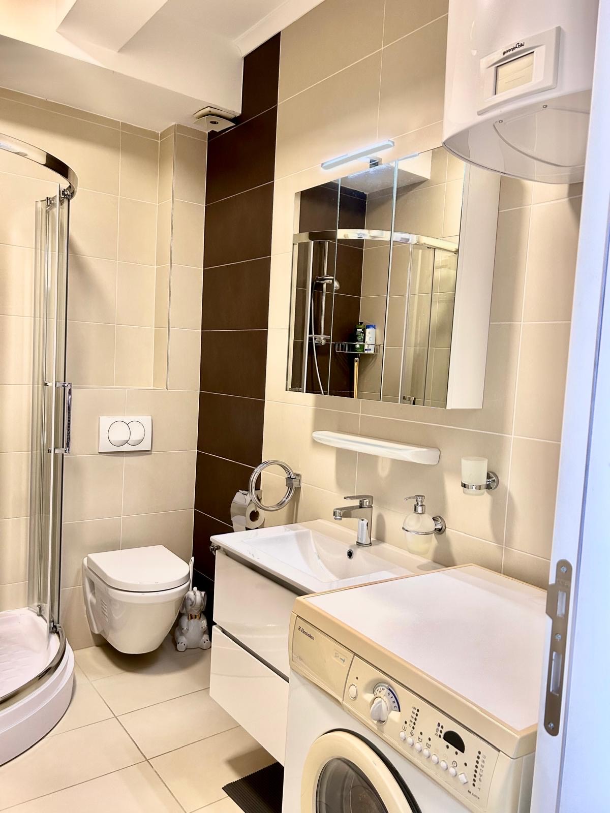 ENG – Lux equipped, furnished apartment in a new building, very bright and sunny, southwest facing. Fully furnished kitchen, living room, dining room. The sleeping area is in the living room. Central heating, pay per consumption. The owner speaks Russian and can register at the address.