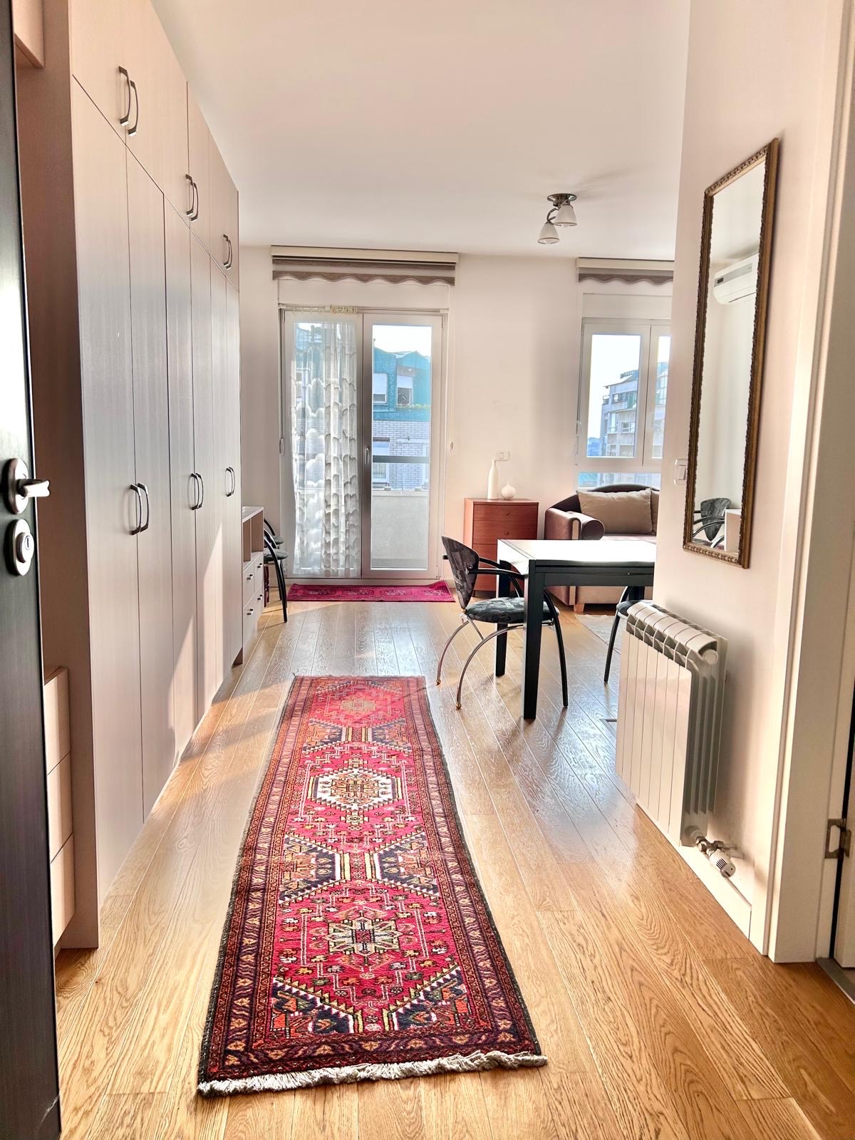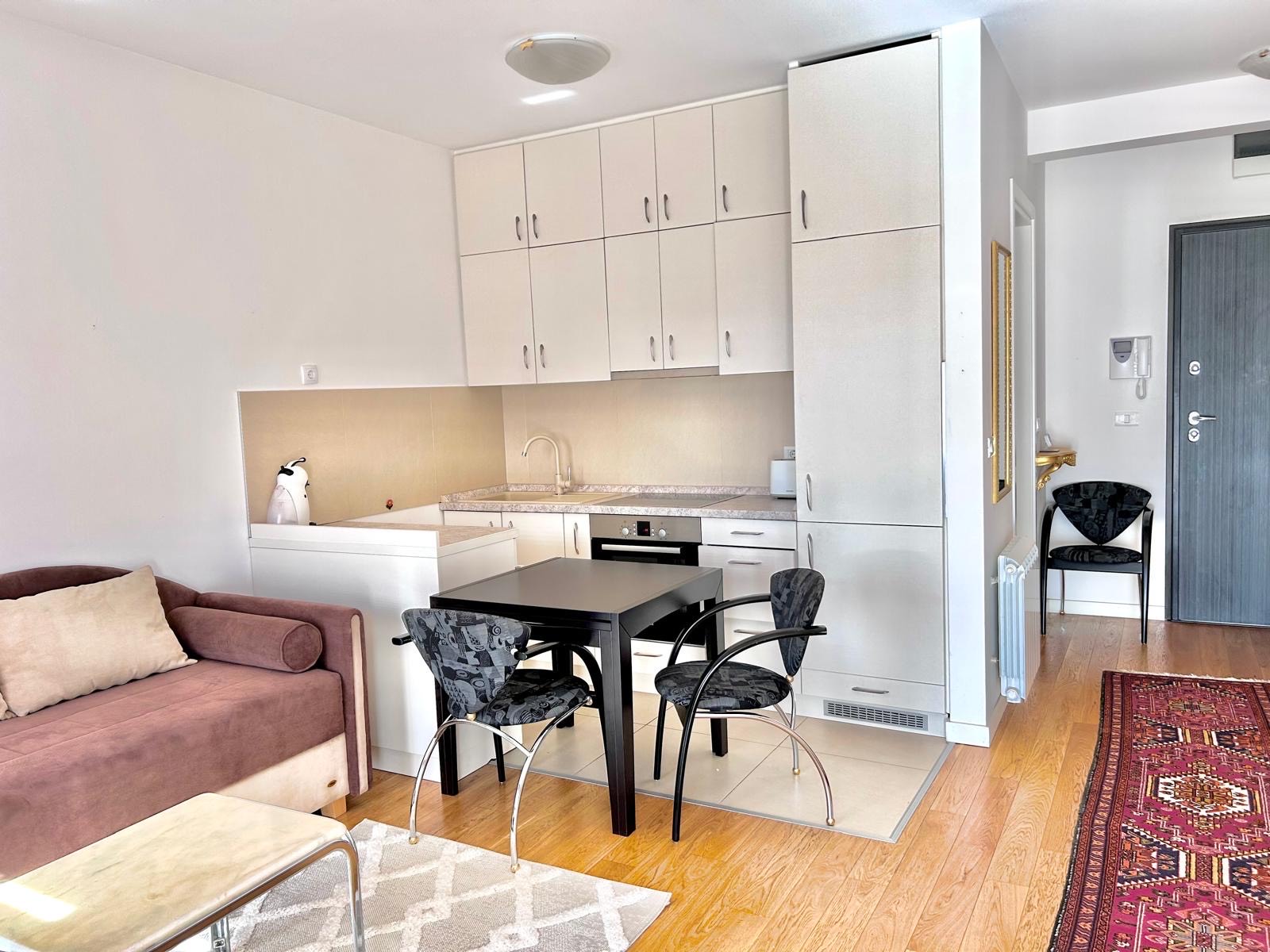 SR – Lux opremljen, namešten stan u novogradnji, veoma svetao i osunčan, jugozapadno okrenut. Kompletno nameštena kuhinja, dnevni boravak, trpezarija. Spavaći deo je u dnevnom boravku. Grejanje centralno, plaćanje po potrošnji. Vlasnik govori ruski može beli karton.