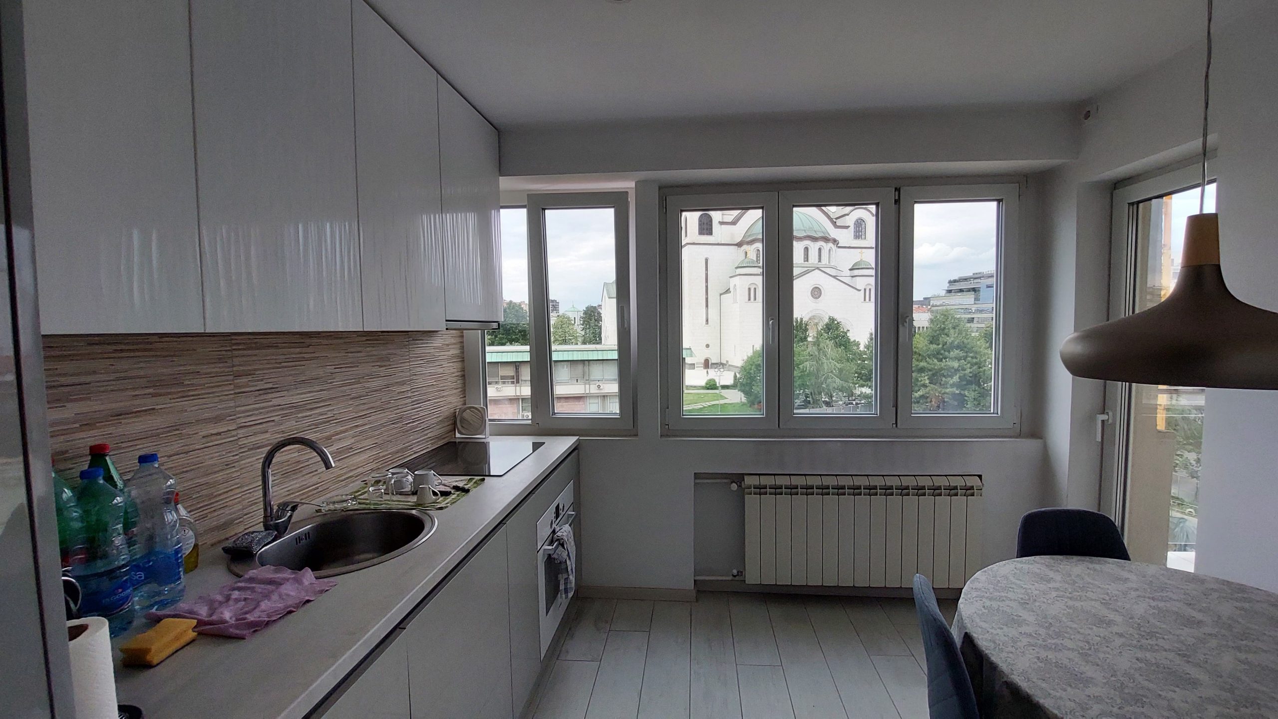 Izuzetan stan na prvoj liniji sa prelepim pogledom na Hram Svetog Save, dve sobe od kojih jedna sa svojom terasom, kuhinja posebno i prelep salon sa terasom i izuzetnim pogledom na Hram.