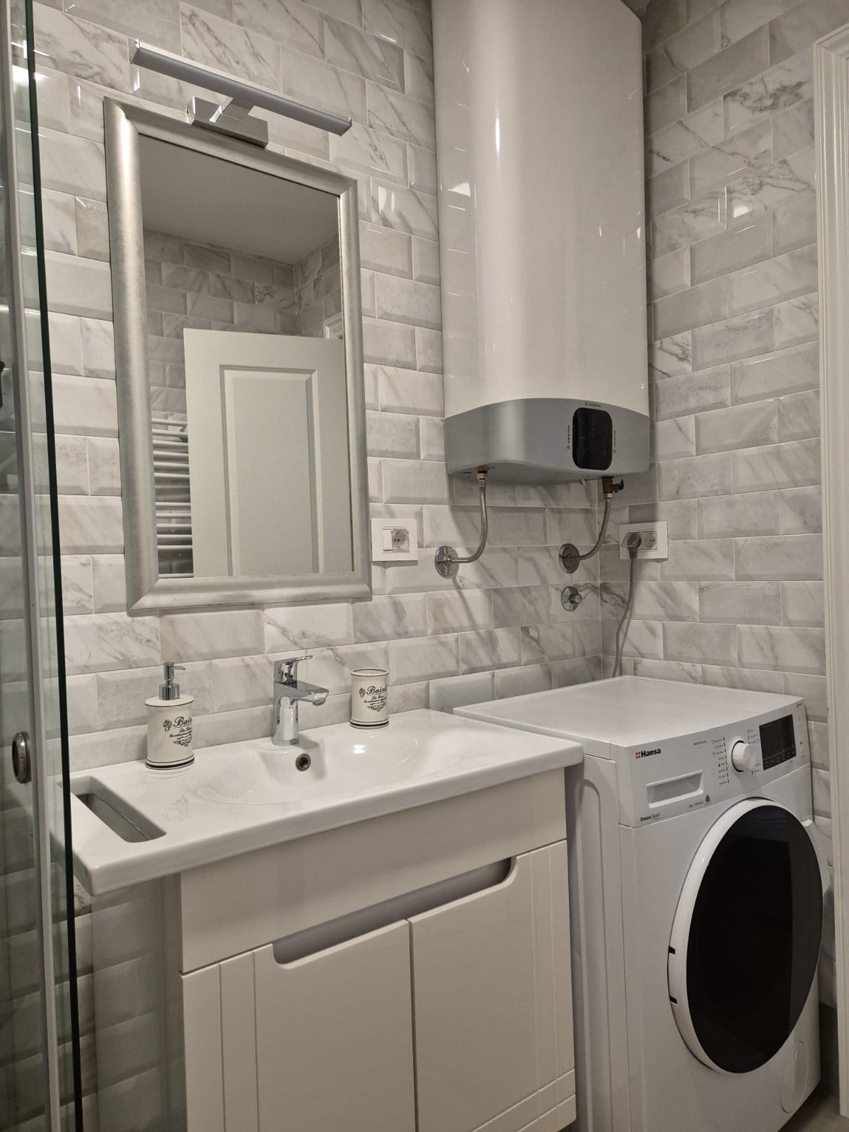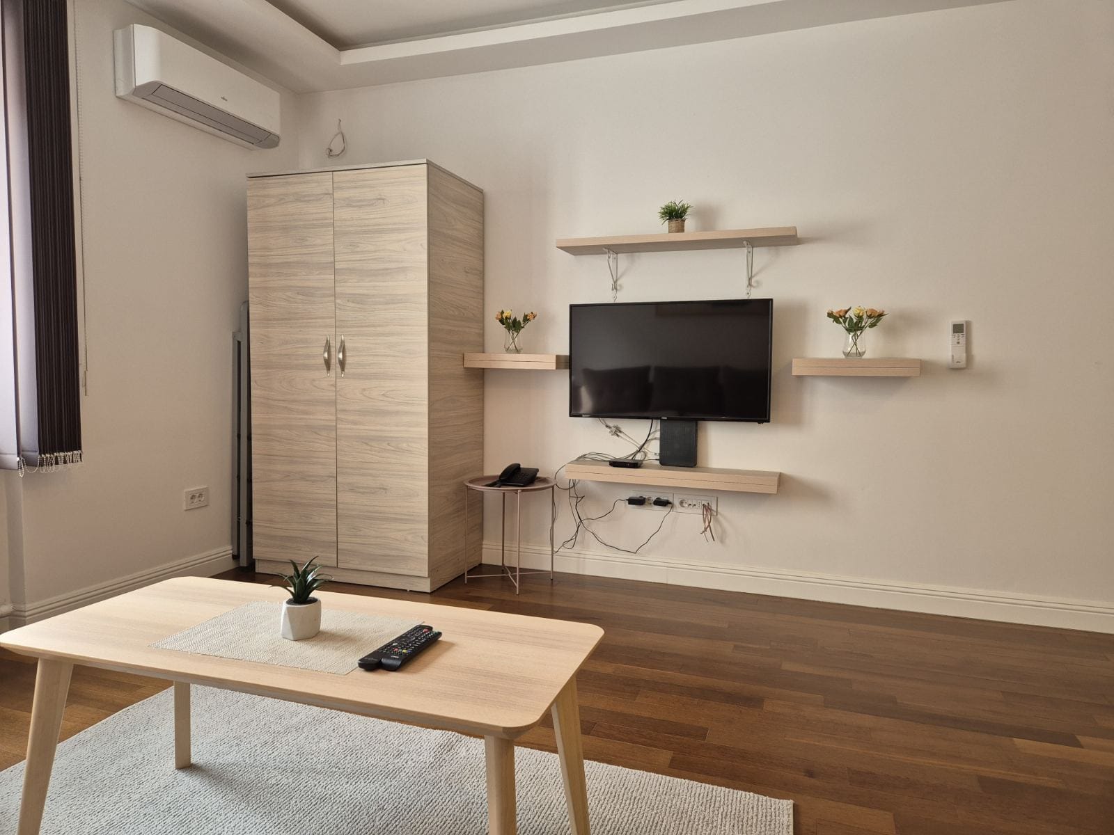 It consists of an entrance hall, spacious living room with kitchen and dining room, bathroom and bedroom. It is very bright, oriented on two sides, the living room faces the street, and the bedroom faces the courtyard of the building. The apartment is fully furnished with everything necessary for a pleasant stay.