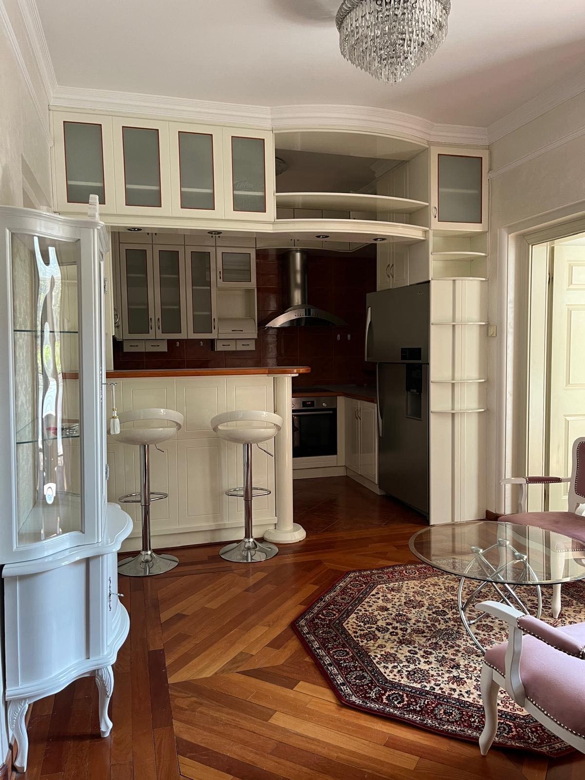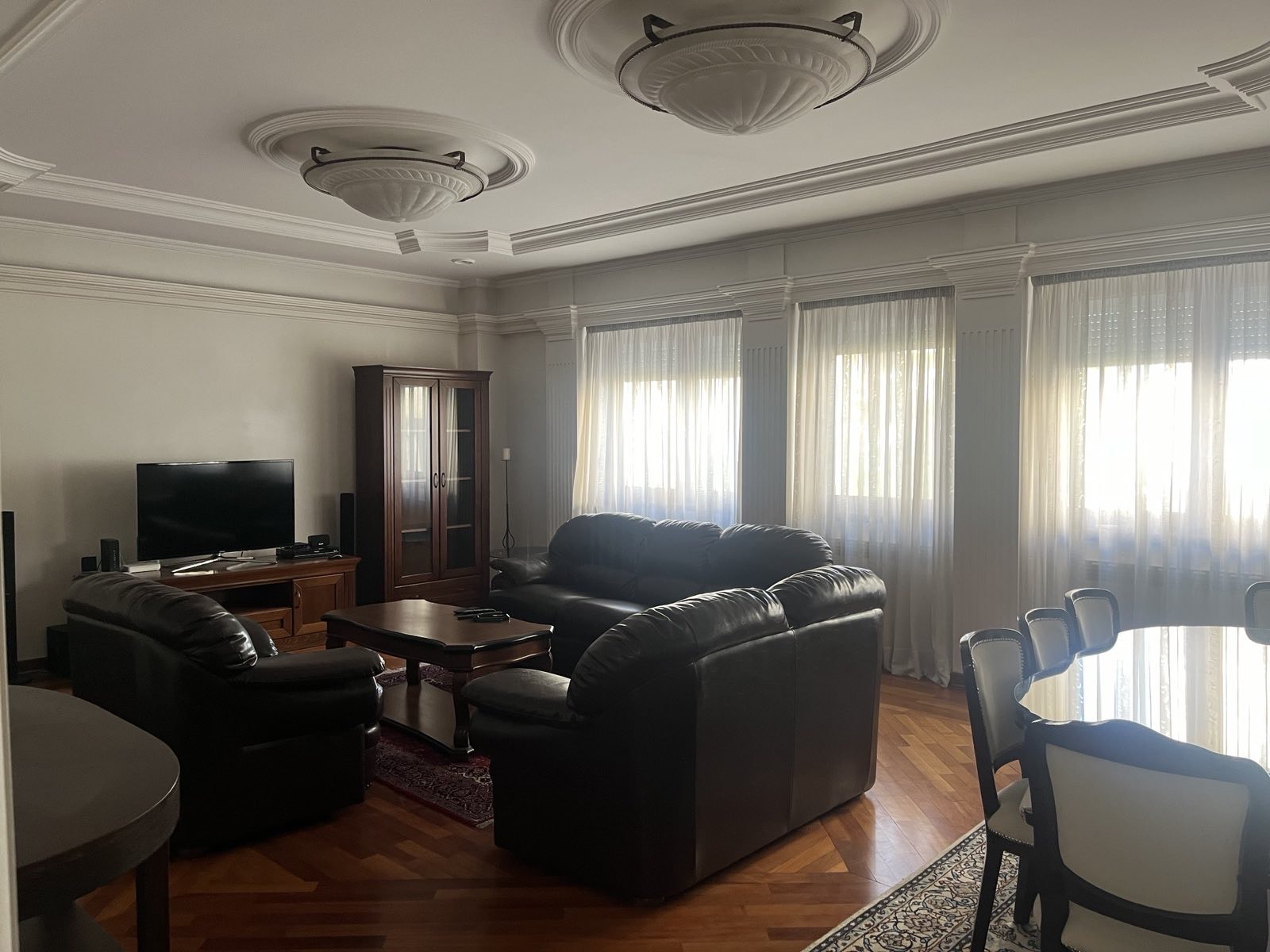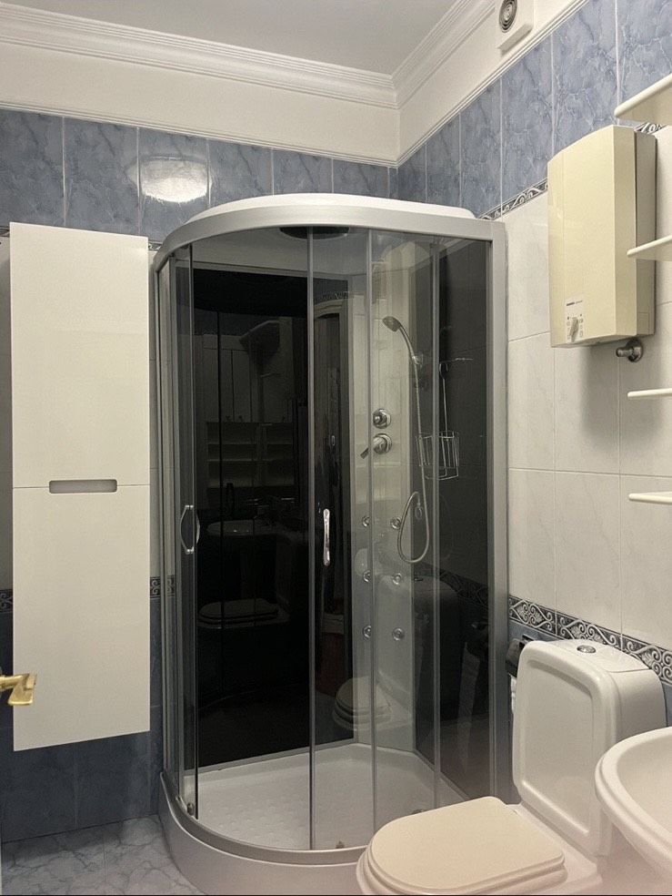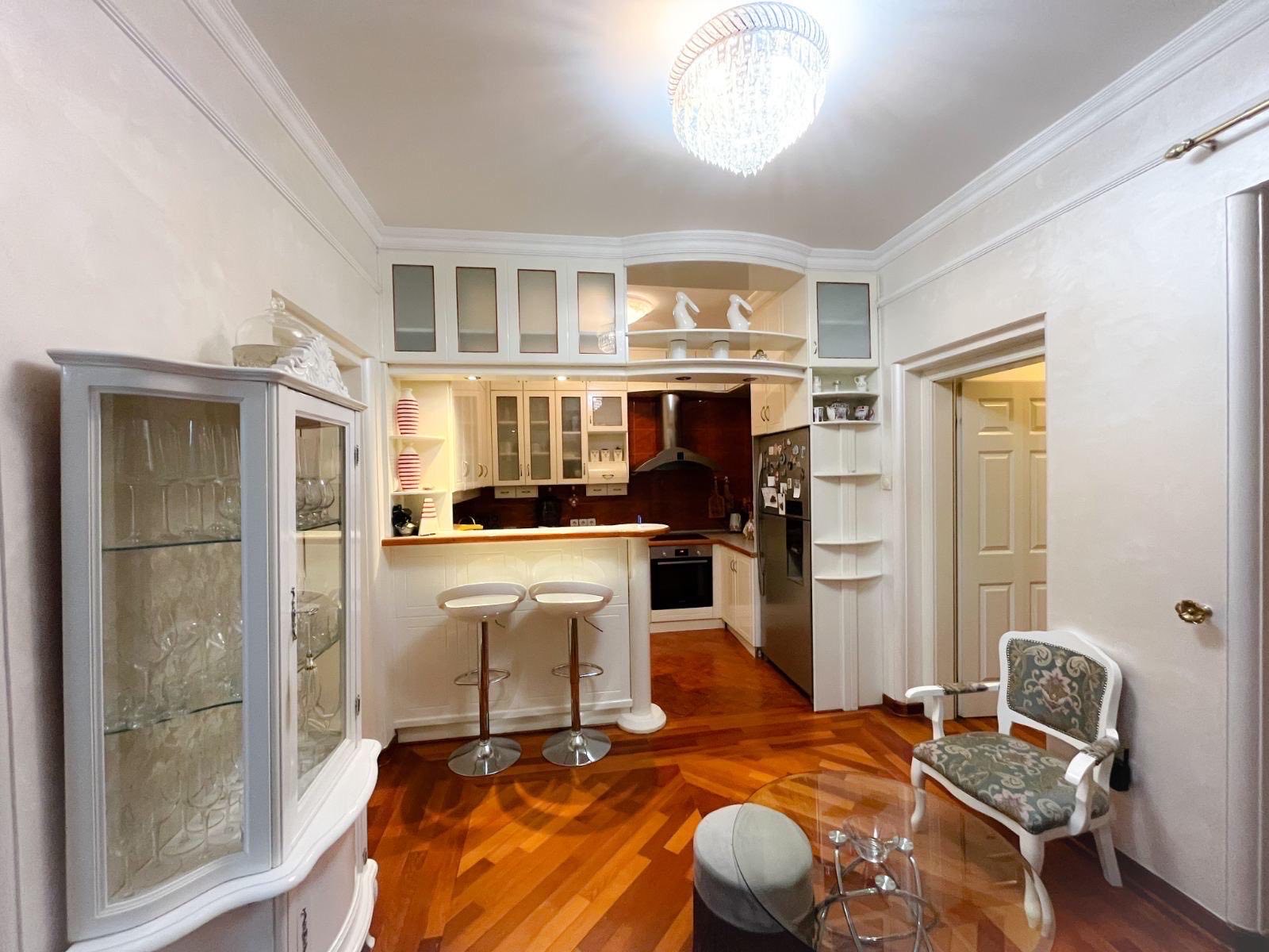 This three-bedroom apartment of 110 m2 has a luxurious living room of 38 m2 with rich plasterwork and ambient lighting, two separate bedroom blocks (master rooms with bathrooms and massage cabin), laundry room, 3 wet rooms, kitchen with dining room, wardrobe, built-in wardrobes, three air conditioners and security doors.
