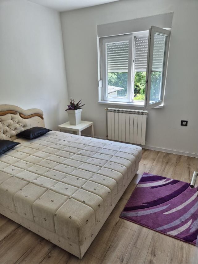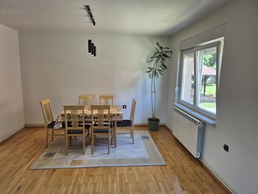 Izdaje se prostrana, sređena, održavana kuća sa velikim dvorištem u veoma mirnom kraju. Kuća sadrži četiri spavaće sobe, dnevnu sobu, kuhinju, trpezariju, dva kupatila, garažu, dve dodatne prostorije i tri terase. Kuća je okružena dvorištem punog zelenila. Ispred kuće se nalazi 3-4 parking mesta. Izdaje se nameštena sa svim potrebnim kućanskim aparatima ili polunameštena u zavisnosti od potrebe. Prednost na duži period.